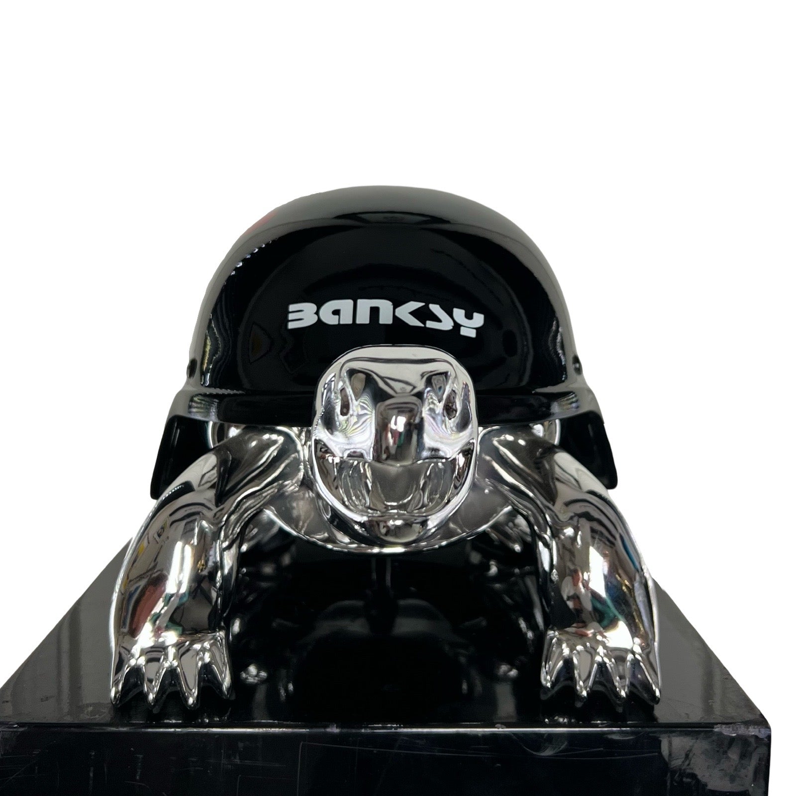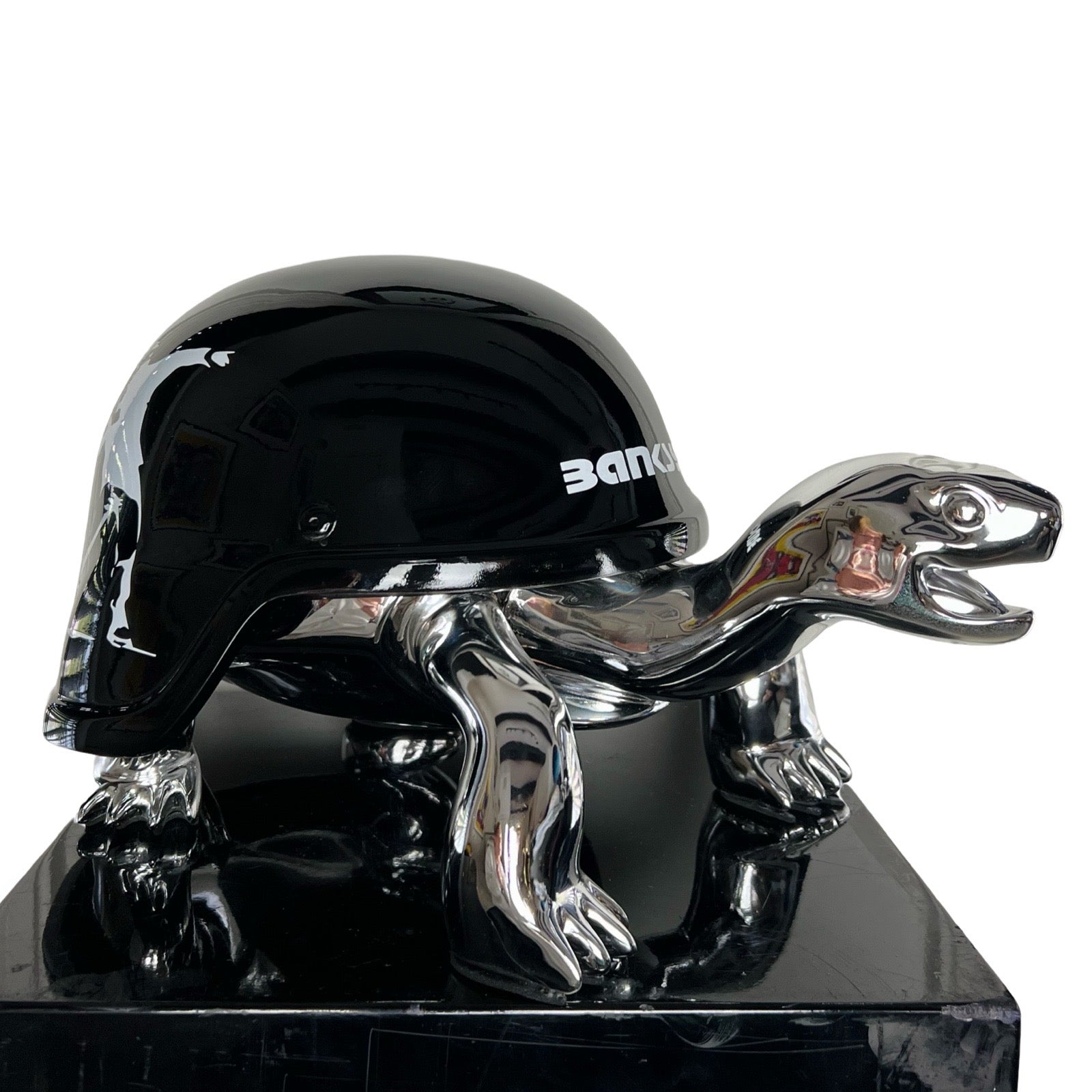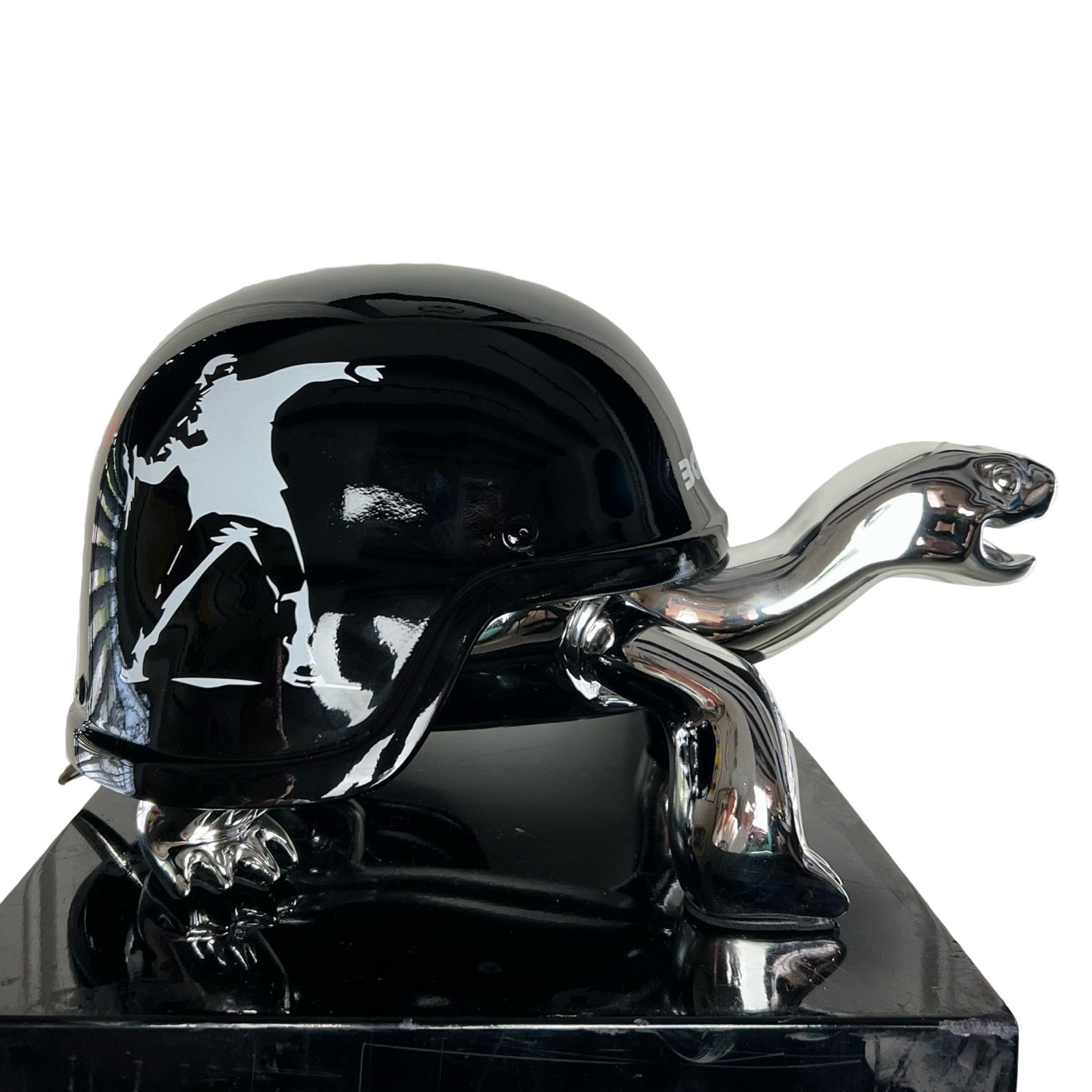 Van Apple created the Peace Turtles on his own artistic way. He gave the turtles a helmet instead of their shell, to show his love and respect for these protected species. The turtles are created in gold to express their value and are given a colorful and contemporary helmet, each design makes a statement.