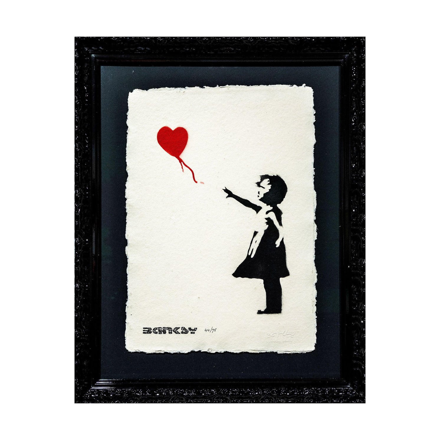 After Banksy - Girl with the Balloon inclusief hoogglans barok lijst met art glas.