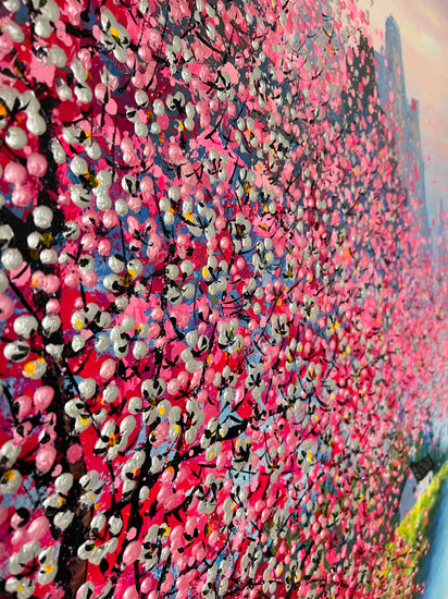 Origineel bloesem bomen kunstwerk van kunstenaar Je Shen inclusief witte baklijst.
