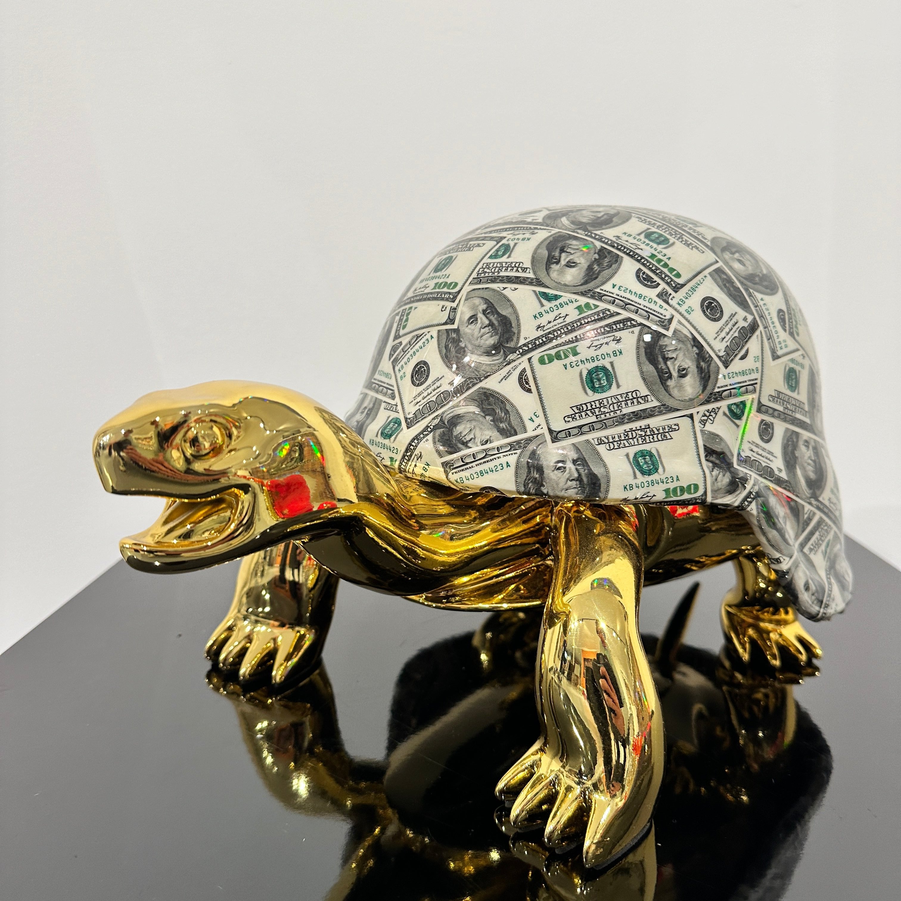 Van Apple created the Peace Turtles on his own artistic way. He gave the turtles a helmet instead of their shell, to show his love and respect for these protected species. The turtles are created in gold to express their value and are given a colorful and contemporary helmet, each design makes a statement.