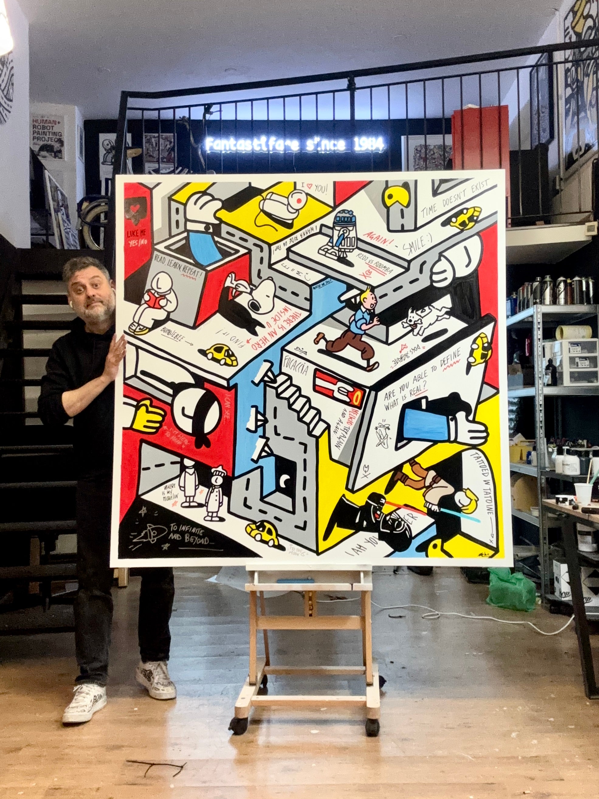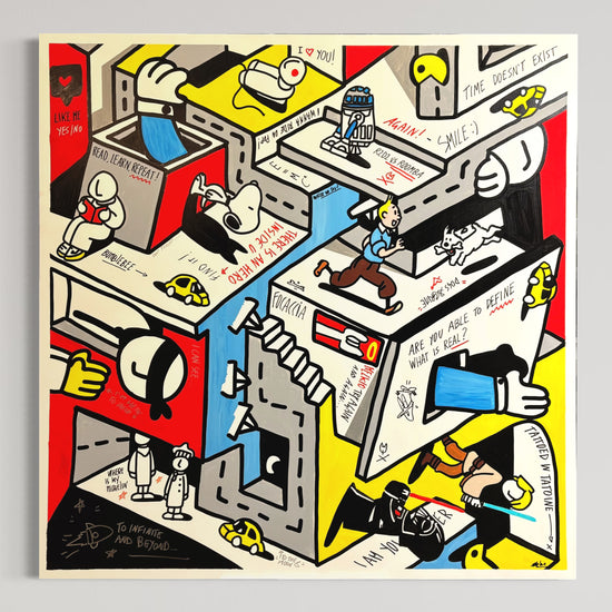 he aim of this canvas is the paradox, in this superstructured block we see R2D2 vs Roomba, Tin Tin running to Milou, and funny walls writing like “ Time doesn’t exist” or “ Melkio try again and again”. Changing the orientation it will change the point of view, a lesson of life!